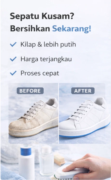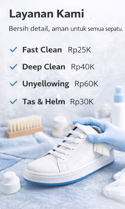 Kicks Clean adalah layanan cuci sepatu di Kota Malang yang mengutamakan kebersihan, detail, dan harga terjangkau. Kami menggunakan teknik pembersihan yang aman untuk menjaga kualitas sepatu Anda — dari daily sneakers hingga sepatu premium.